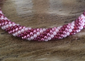 Käytin kolmea eriväristä punaista siemenhelmeä ja niitä tosiaan pujottelin virkkauslankaan aina samassa järjestyksessä n 1.5m.